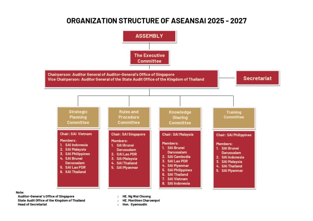 The Assembly, as a highest decision-making body, is composed of all ASEANSAI members who serves as the Auditor General or Head of each SAI while the Executive Committee comprises of the Chairperson and Vice Chairperson of ASEANSAI. The membership of ASEANSAI comprises of 10 SAIs of the ASEAN Member States.